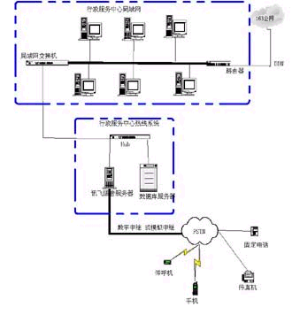 政府群眾一線通”系統(tǒng)可以通過局域網連入行政中心局域網交換機,從而實現(xiàn)與整個行政服務中心的信息共享和熱線系統(tǒng)服務內容的自動更新。具體網絡拓撲結構如下: