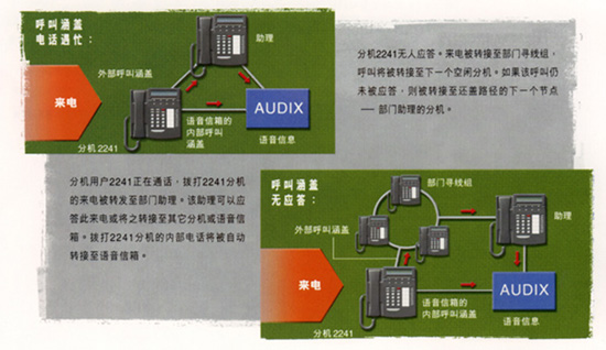 當(dāng)最初的被叫方不能接聽來話時,呼叫涵蓋功能可將來話轉(zhuǎn)接到另外一個分機(jī)。您可以自行規(guī)定判斷是否轉(zhuǎn)接的標(biāo)準(zhǔn)以及涵蓋通道的條件,如無應(yīng)答、 無此號碼、遇忙籌。DEFINITY BCS還可以識別內(nèi)部和外部呼叫,并為其提供不同的涵蓋通道。