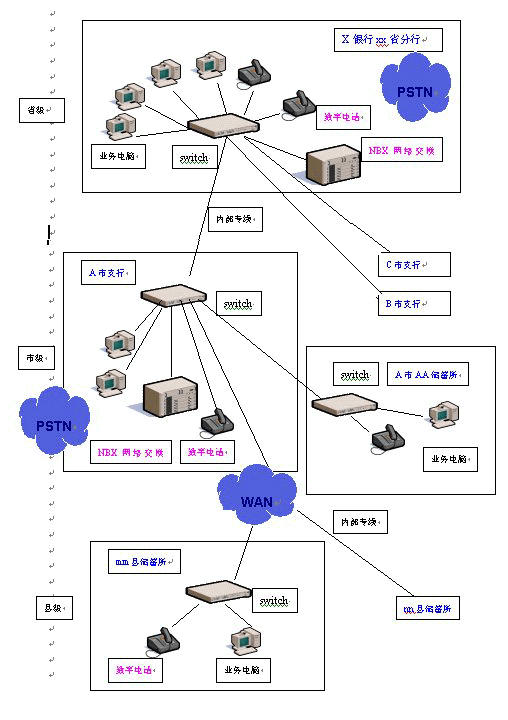 將省、市級分行原來使用的普通電話線路與NBX網(wǎng)絡(luò)交換機(jī)相連,那么全省各地儲蓄所的數(shù)字話機(jī)就可以撥打全省系統(tǒng)以外的普通電話。因為各個縣市區(qū)之間是均有專線相連,所以各市區(qū)異地?fù)芙兄挥惺性挷糠质鞘褂绵]電局線路,長途線路以內(nèi)部數(shù)據(jù)網(wǎng)代替,因此長途業(yè)務(wù)只需繳納市話費就可以。