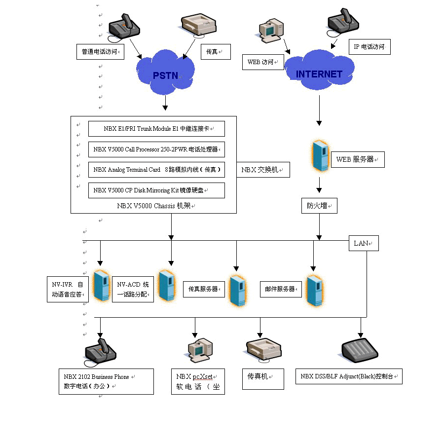 北京晨報的客戶服務(wù)中心項(xiàng)目是一個集呼叫中心與辦公系統(tǒng)于一體的語音、數(shù)據(jù)服務(wù)平臺。通過一條E1中繼線與外部電話網(wǎng)相聯(lián)。內(nèi)部使用50部數(shù)字電話進(jìn)行處理辦公業(yè)務(wù),10個呼叫中心坐席采用計(jì)算機(jī)的軟電話(pcXset)實(shí)現(xiàn)與客戶的交談,傳真服務(wù)器通過NBX所提供的8條模擬內(nèi)線與外界互通。