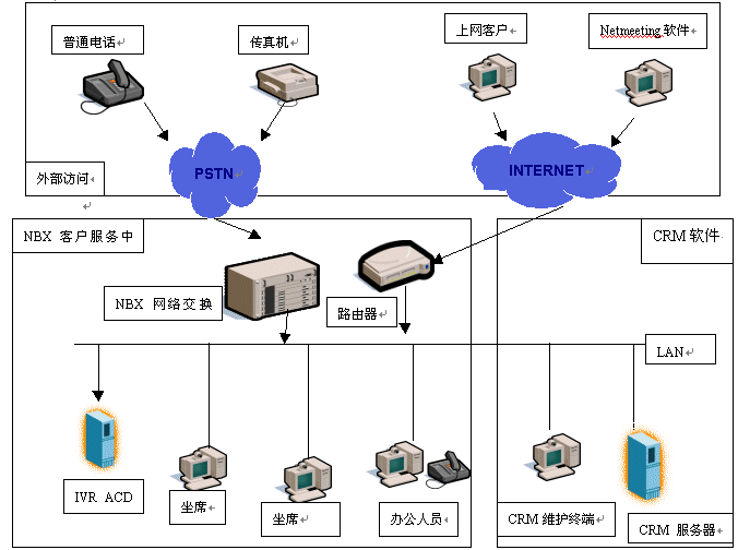 NBX客戶服務(wù)中心是基于3Com公司的NBX網(wǎng)絡(luò)電話交換機(jī)平臺構(gòu)筑的新一代呼叫中心,首先它擴(kuò)大了服務(wù)方式,客戶不但可以通過電話得到服務(wù),還可以在上網(wǎng)訪問企業(yè)主頁的同時使用耳機(jī)、麥克風(fēng)直接與服務(wù)代理人員(AGENT)語音通話,一邊瀏覽網(wǎng)頁,一邊交談,增加交流的信息輔助量。還可以通過電子郵件、傳真等方式完成與企業(yè)信息交流,其次NBX客戶服務(wù)中心內(nèi)部數(shù)據(jù)、語音兩網(wǎng)合一的布線結(jié)構(gòu),不但提高了呼叫中心的穩(wěn)定性,而且使客戶數(shù)據(jù)能與電話語音同步協(xié)調(diào),完成具有針對性的一對一的客戶服務(wù)。