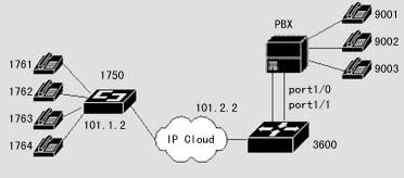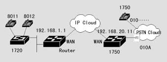 1720也可以通過器語音端口連接到PSTN,通過二次撥號,使得兩地的PSTN用戶可以通過IP網(wǎng)絡互相通話,而話費只是市話的費用。