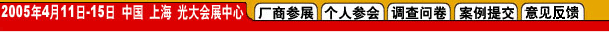 展覽大廳開放時(shí)間:2005年4月13日1:30pm —— 4月15日 03:30pm 注:以上日程內(nèi)容,將根據(jù)參展廠商提交資料的進(jìn)展情況隨時(shí)更新,敬請留意。