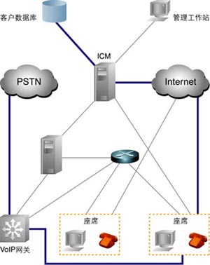 每個(gè)IPCC解決方案均包括Cisco VoIP網(wǎng)關(guān),該網(wǎng)關(guān)通過將模擬與數(shù)字語(yǔ)音轉(zhuǎn)化為IP包并在PSTN與Cisco AVVID IP電話網(wǎng)絡(luò)之間建立連接路徑。該網(wǎng)關(guān)由Cisco CallManager進(jìn)行管理與控制。