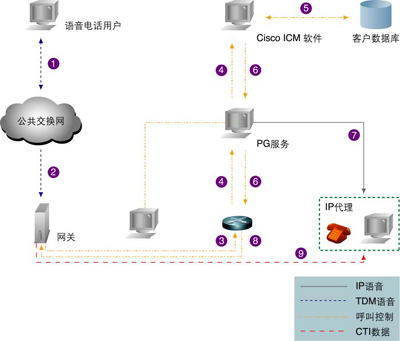 CallManager。(4)Cisco CallManager通過ICM PG把該路由申請(qǐng)送到ICM。(5)ICM檢查客戶的賬號(hào)信息,并通過對(duì)賬號(hào)信息的分析確定路由。(6)ICM調(diào)用一個(gè)客戶定義的路由腳本,以便選擇最合適的IPCC代理受理客戶的請(qǐng)求,并通過外設(shè)網(wǎng)關(guān)(PG)轉(zhuǎn)給目標(biāo)CCM。(7)PG發(fā)送客戶信息數(shù)據(jù)到目標(biāo)IPCC代理的桌面(在屏幕上彈出信息框)。(8)CCM指示VoIP網(wǎng)關(guān)連接客戶和目標(biāo)代理。(9)VoIP網(wǎng)關(guān)建立語(yǔ)音連接。
