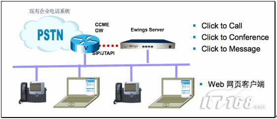 UC點點通解決方案,由網(wǎng)關,服務器,IP電話和客戶端組成,如圖5所示: