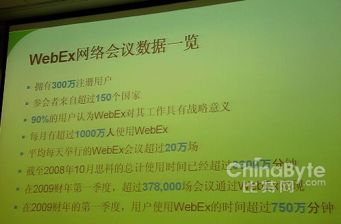 網(wǎng)絡(luò)會議在中國普及率還相對滯后,不同行業(yè)的跨度也不一樣,用WebEx做什么也有差異。制造業(yè)和高科技領(lǐng)域使用最廣,因為他們喜歡學習使用高科技。目前正在向其他領(lǐng)域擴展。比如目前阿里巴巴在用,也在慢慢擴展到金融等行業(yè)。