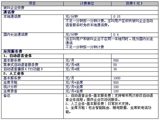 2、被叫企業(yè)資費標準如下: