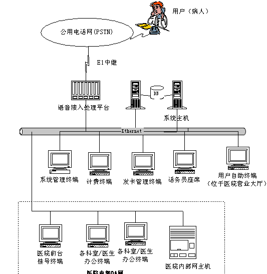 為了配合呼叫中心的運(yùn)作,給用戶(病人)就診提供方便,醫(yī)院需要為用戶設(shè)計(jì)和提供一個(gè)就診卡,該卡實(shí)際就是用戶的身份識(shí)別和資料存儲(chǔ)的ID卡。用戶第一次就診掛號(hào)時(shí),首先要到醫(yī)院登記,同時(shí)醫(yī)院為每個(gè)用戶分配一個(gè)ID號(hào)。以后,用戶就可以通過(guò)電話完成掛號(hào)或者進(jìn)行專家咨詢,也可以雜醫(yī)院的自助終端上完成掛號(hào),通過(guò)電話輸入ID號(hào)就可以識(shí)別用戶身份。