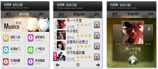 6)彩鈴定制業(yè)務(wù)。傳統(tǒng)彩鈴定制業(yè)務(wù)基于純語音IVR的環(huán)境下使用起來非常繁瑣,進(jìn)行彩鈴檢索比較麻煩,選擇的準(zhǔn)確度也很低。手機(jī)客戶端軟件的應(yīng)用,提供了可視化的交互方式,讓業(yè)務(wù)使用起來直觀便捷很多。用戶通過聲動(dòng)魅力完成彩鈴信息的瀏覽、試聽、定制過程,用戶可以邊瀏歌曲的同時(shí)邊聽到語音對歌曲的介紹,并可試用該歌曲。下圖即為彩鈴定制業(yè)務(wù)操作界面: