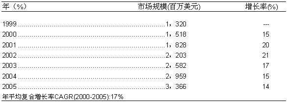 如圖一所示,1999年,美國的固定網(wǎng)OSS服務(wù)保障的市場規(guī)模約為13.2億美元。而在2000年,這一市場比上一年增長了15%,達到15.18億美元。根據(jù)Frost & Sullivan的預(yù)測,從2000年到2005年間,美國的固定網(wǎng)OSS服務(wù)保障市場的年平均復(fù)合增長率將高達17%,市場規(guī)模在2005年預(yù)計會增長至33.66億美元。