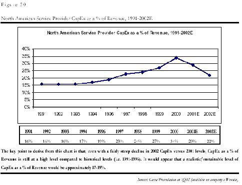 和中國(guó)的問(wèn)題一樣,制造商的問(wèn)題是電信服務(wù)企業(yè),即運(yùn)營(yíng)商的投入減少造成的。由于上世紀(jì)末互聯(lián)網(wǎng)和電子商務(wù)泡沫的虛假繁榮的影響,各運(yùn)營(yíng)商都嚴(yán)重高估了市場(chǎng)需求,認(rèn)為需求是會(huì)隨著通信能力的增強(qiáng)無(wú)限增加,因此市場(chǎng)規(guī)模是會(huì)無(wú)限擴(kuò)張的,他們?cè)谌狈?duì)最終用戶需求的深入分析的前提下,普遍在基礎(chǔ)設(shè)施的建設(shè)上進(jìn)行了超大規(guī)模的投入,其基礎(chǔ)設(shè)施建設(shè)投入在收入中的比例一度在2000年從平均的15%達(dá)到了創(chuàng)記錄的35%!