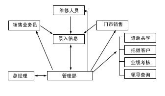 根據(jù)英普的業(yè)務(wù)管理模式,公司將門市銷售、維修部、大客戶部的業(yè)務(wù)管理工作,交由管理部全部管理和協(xié)調(diào),這三個部門將各自與客戶接待、交往過程、工作計劃全部明細記錄,交由管理部確認,管理部在保證必要保密的情況下,進行工作再分配,同時加強業(yè)務(wù)考核和其他管理職能工作。其業(yè)務(wù)流程如圖1。
