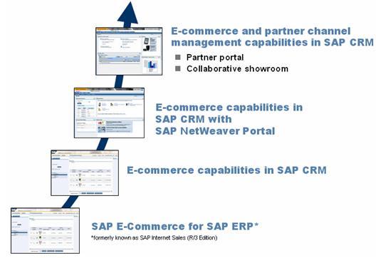從上圖中,我們可以清楚地看出SAP的電子商務(E-Commerce)功能經歷了一個不斷進化的過程。主要分成以下四個階段: