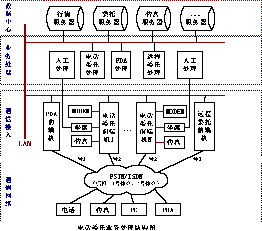 另一種方案是PDA和證券營業(yè)部前端機(jī)(實(shí)際就是電話委托前端機(jī))采用FSK通訊方式,使用電話委托的通道來完成所有的委托查詢。這種方式的速度快,信息容量大,保密性強(qiáng),而且營業(yè)部不需單獨(dú)申請電話線路,PDA和電話委托線路可動(dòng)態(tài)分配,使其電話線路得到最大限度的利用。另外,營業(yè)部對外形象也好,只用一個(gè)號碼就可讓股民完成電話委托、PDA委托等多種委托方式,給股民帶來了方便。不過這種方式需要得到電話語音卡提供廠商的產(chǎn)品技術(shù)支持,語音卡必須同時(shí)支持標(biāo)準(zhǔn)的DTMF和FSK的方式,卡上有充足的能力來處理兩種方式,在語音處理卡的底層驅(qū)動(dòng)應(yīng)該將電話和PDA的委托區(qū)別開來,目前市場能夠完全支持這種應(yīng)用的只有深圳市東進(jìn)通訊技術(shù)股份有限公司的產(chǎn)品,東進(jìn)技術(shù)的新一代PCI系列語音卡數(shù)字卡和模擬卡都完全采用DSP(數(shù)字信號處理器)架構(gòu),卡上有專用DSP來處理DTMF和FSK的收發(fā),是目前PDA委托前端的最好選擇;這種方案還應(yīng)該得到證券電話委托系統(tǒng)的開發(fā)商的支持,在電話委托系統(tǒng)里增加處理PDA委托的功能。目前恒基偉業(yè)的“股靈通”就是采用這種方式。