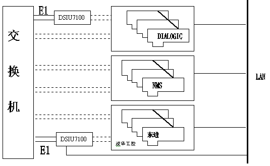 電信企業(yè)已有的112、114、170、189、180等系統(tǒng),這些系統(tǒng)的硬件設(shè)備各成體系,很可能由不同廠家的板卡組成:DIALOGIC、東進(jìn)、NMS,或其他品牌;還可能采用不同的信令方式:NO.1 信令、NO.7信令、 ISDN信令。如何把五花八門的系統(tǒng)集成起來(lái),以有效利用、降低成本?東進(jìn)七號(hào)網(wǎng)關(guān)DSIU7100提供解決此問題的最好解決方案,系統(tǒng)可兼容不同廠家生產(chǎn)的不同數(shù)字中繼接口的語(yǔ)音板卡,最大限度的利用原有資源,結(jié)構(gòu)如下圖所示: