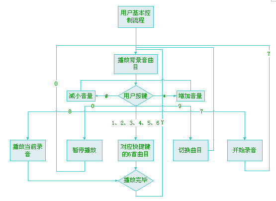用戶設(shè)定:用戶可以通過語(yǔ)音自動(dòng)導(dǎo)航或者通過上網(wǎng)來(lái)自主選擇并設(shè)定背景音效,并把其中最常用的六種音效對(duì)應(yīng)1~6號(hào)按鍵,這樣用戶在自己使用的過程中就可以根據(jù)當(dāng)時(shí)的情況使用自己喜歡的背景音效了。