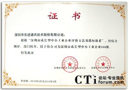CTI論壇(ctiforum)4月6日消息(記者 潘婷婷):由深圳市政府大力支持,深圳市科工貿(mào)信委、深圳市中小企業(yè)服務(wù)中心,深圳市統(tǒng)計局,深圳大學(xué)管理學(xué)院聯(lián)合組織評測的“深圳市成長型中小工業(yè)企業(yè)500強”,于3月31日被正式認(rèn)定,深圳市東進通訊技術(shù)股份有限公司榮列其中。今后,作為深圳市中小企業(yè)成長工程的重點培育對象,東進技術(shù)將獲得政府公共資源的傾斜扶持,促進加快發(fā)展,形成“示范效應(yīng)”。