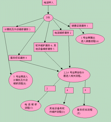 在交互式語音應(yīng)答系統(tǒng)IVR的幫助下,各服務(wù)流程有條不紊地進(jìn)行,每個職能部門管理自己部門的流程,提供全方位的客戶所要求的服務(wù)。下面我們以銷售咨詢?yōu)槔,看看這個簡單的工作流程。
