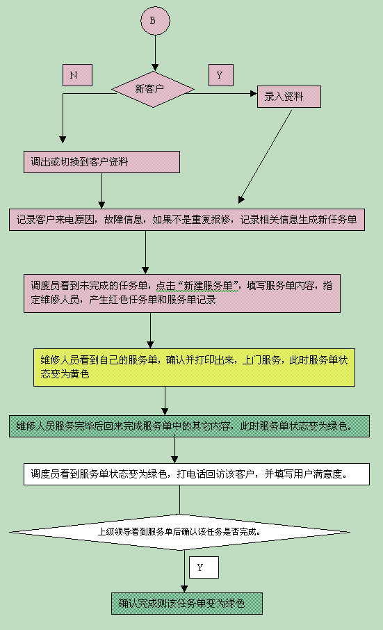 如果是需要上門維修的客戶,點(diǎn)擊"新建任務(wù)單",填寫任務(wù)單上的相關(guān)內(nèi)容,此時任務(wù)單狀態(tài)為紅色;調(diào)度員看到新任務(wù)單,點(diǎn)擊"新建服務(wù)單",填寫服務(wù)單內(nèi)容,指定維修人員。此時任務(wù)單狀態(tài)變?yōu)榧t色,服務(wù)單狀態(tài)則為紅色。維修人員看到自己的服務(wù)單,確認(rèn)并打印出來,上門服務(wù),此時服務(wù)單狀態(tài)變?yōu)辄S色;維修人員服務(wù)完畢后回來完成服務(wù)單中的其它內(nèi)容,此時服務(wù)單狀態(tài)變?yōu)樗{(lán)色;調(diào)度員看到服務(wù)單狀態(tài)變?yōu)樗{(lán)色,打電話回訪該客戶,并填寫用戶滿意度;上級領(lǐng)導(dǎo)看到服務(wù)單后確認(rèn)該任務(wù)是否完成。確認(rèn)完成則該任務(wù)單變?yōu)樗{(lán)色,否則再派出一張服務(wù)單。直到任務(wù)完成。