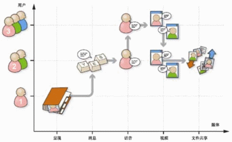 如圖1所示,用戶首先打開基于呈現(xiàn)業(yè)務(wù)的地址簿,向其好友發(fā)送一條消息,然后向該好友發(fā)起一個(gè)話音呼叫,在通話過程中又添加一個(gè)新的對(duì)象,隨后在這個(gè)多方通話中又添加了視頻業(yè)務(wù),接下來又去除一個(gè)對(duì)象,多方通話恢復(fù)為雙方通話,最后使用了文件共享業(yè)務(wù)。所有這些多媒體業(yè)務(wù)都是由用戶的一個(gè)SIP會(huì)話控制和激活的。