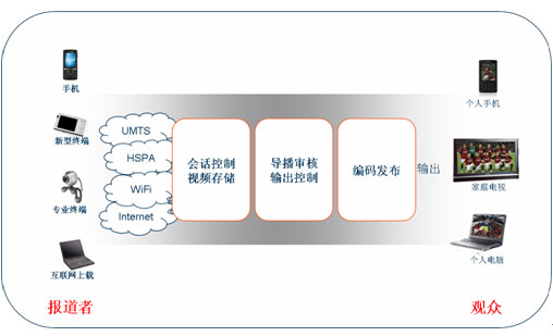 如今手機(jī)能拍照、攝像并不稀奇,攝像頭幾乎成了手機(jī)的標(biāo)準(zhǔn)配置,視頻通話(huà)也是3G特色業(yè)務(wù)之一,但要把手機(jī)拍攝的圖像實(shí)時(shí)回傳到電視臺(tái),并合理地發(fā)送到直播節(jié)目中卻還需要打通很多環(huán)節(jié)?偟膩(lái)說(shuō),電視臺(tái)需要的是一個(gè)業(yè)務(wù)控制平臺(tái),使后臺(tái)導(dǎo)播人員能監(jiān)控、審核手機(jī)回傳的多路視頻信號(hào),根據(jù)需要選取其中的合適內(nèi)容插入到直播節(jié)目中,同時(shí)系統(tǒng)還應(yīng)該能夠根據(jù)需求同時(shí)輸出各種格式的視頻,發(fā)布到電視頻道、互聯(lián)網(wǎng)或者手機(jī)電視中。