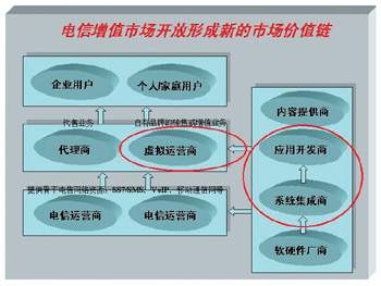 在電信增值市場開放的背景之下,新的市場價值鏈正在形成(如圖所示)。國內(nèi)電信建設(shè)轟轟烈烈的大規(guī)模基礎(chǔ)設(shè)施投資已是明日黃花,改善應(yīng)用“稀缺”的現(xiàn)狀才是當(dāng)務(wù)之急。李峻認為,信息產(chǎn)品技術(shù)服務(wù)提供商最主要的任務(wù),就是幫助運營商開發(fā)針對中國市場的增值業(yè)務(wù),并帶動其主業(yè)協(xié)同發(fā)展。即面向電信網(wǎng)絡(luò)運營商以及虛擬運營商,提供增值業(yè)務(wù)系統(tǒng)整體解決方案及其軟硬件支撐平臺和應(yīng)用系統(tǒng)。