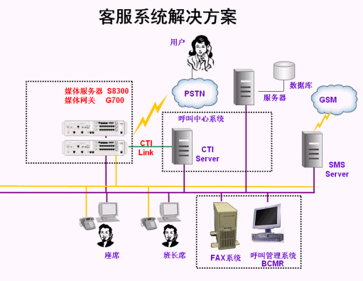 - 采用AVAYA S8300交換機(jī)做為客戶(hù)服務(wù)中心的核心電話(huà)接入平臺(tái),系統(tǒng)中配置CTI接口模塊和內(nèi)置的自動(dòng)呼叫分配軟件包。