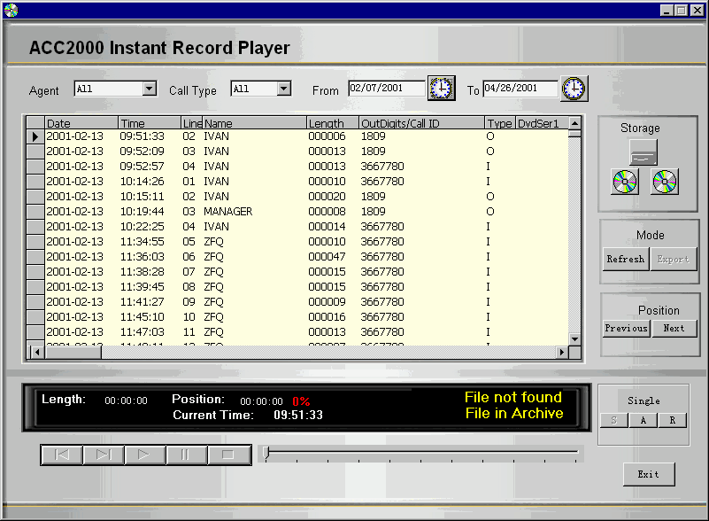 管理員可以通過MMPlayer對錄制的語音進(jìn)行回放,系統(tǒng)提供完善的檢索功能,可以根據(jù)來電時間、來電號碼、呼入/呼出以及座席等條件靈活地進(jìn)行查詢,很容易地找回所儲存的每個座席各種事件的詳細(xì)信息,并可以轉(zhuǎn)換成通用的.WAV格式文件在任何PC上進(jìn)行播放,或者通過局域網(wǎng)絡(luò)或互聯(lián)網(wǎng)進(jìn)行分發(fā)。