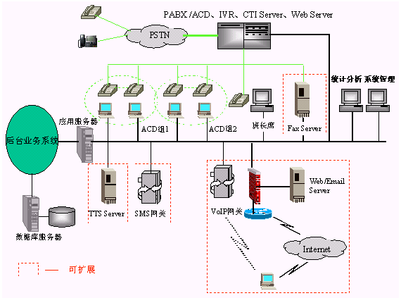 · 一個完整的呼叫中心解決方案通常由以下核心部分組成:自動呼叫分配(ACD)、交互式語音應(yīng)答(IVR)、計(jì)算機(jī)電話綜合應(yīng)用(CTI)、錄音服務(wù)器、呼叫管理(CMS)等。