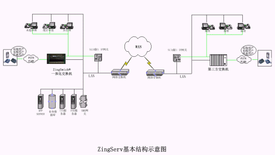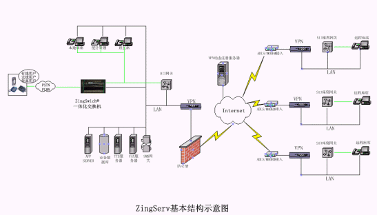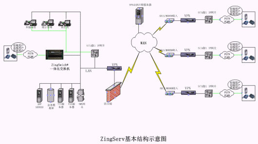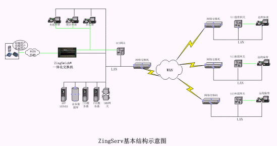 硬件:坐席集中的中心點都有ZingSwitch®交換機,S口網(wǎng)關和CO8卡或E1接口網(wǎng)關和E1卡。VPN動態(tài)注冊服務器和VPN設備,或GK服務器。