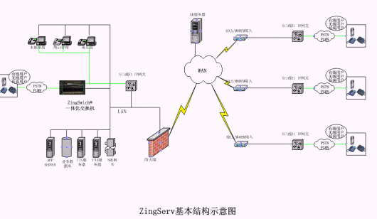 硬件:中心點有ZingSwitch®,O口網(wǎng)關和內(nèi)線卡,VPN動態(tài)注冊服務器和VPN設備,或GK服務器。座席端配置S口網(wǎng)關,根據(jù)需求配置相應的VPN設備。
