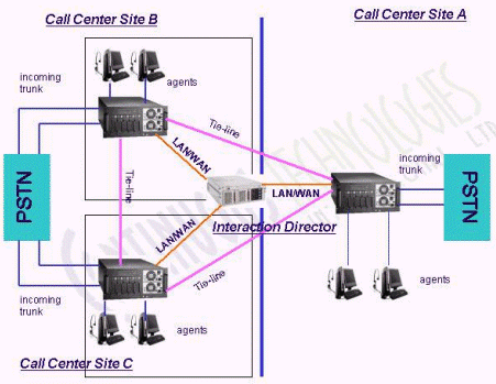 Interaction Director的功能比Interaction Multi-Site還要強大的多,不但支持Interaction Multi-Site的具有的功能外,還支持更大規(guī)模的分布式系統(tǒng)、呼叫前和呼叫后路由(呼叫前路由采用SS7信令,需要電信運營商的支持)以及真正的網(wǎng)絡(luò)排隊機(Network ACD)等。Interaction Director通常安裝在一臺單獨的服務(wù)器上,用來決定最佳分布點的系統(tǒng)處理來電。Interaction Director可以實時監(jiān)控各個分布點的系統(tǒng)負載,坐席、技能、隊列等狀態(tài)。采用Interaction Director可以方便的實現(xiàn)分布式呼叫中心系統(tǒng)的負載均衡和災(zāi)難備份。舉例來說,在周末話務(wù)量較小的情況下,為節(jié)省資源和運營成本,可以將北京中心的所有來電路由至上海中心處理;又如,上海中心發(fā)生故障,可以將所有來電路由至北京中心處理。