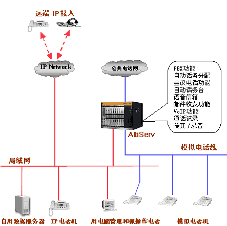 用很少的投資搭建一個以Altiserv為中心的網(wǎng)絡(luò)電話系統(tǒng)可以基本滿足企業(yè)的辦公, 數(shù)字、語音及多媒體通訊的全方位需求。而且隨著您企業(yè)的不斷發(fā)展壯大,奧迪堅隨時可為您增加任何您所需的功能。