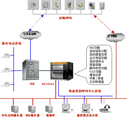 您的企業(yè)內(nèi)部已有一套大型的交換機系統(tǒng),但非常希望在銷售、技術(shù)支持等與客戶接觸頻繁的部門,建立自己的客戶服務(wù)中心系統(tǒng),此時您只需要將奧迪堅高度整合的呼叫中心平臺掛接在您的交換機后端即可。