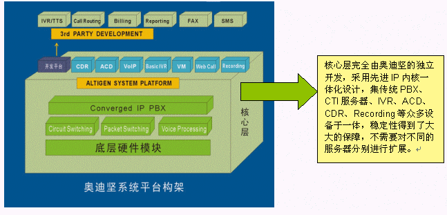 選用美國奧迪堅一體化的硬件和系統(tǒng)軟件的平臺AltiServ 。AltiServ 是整個報業(yè)熱線綜合服務系統(tǒng)的心臟,是系統(tǒng)一切功能的基礎,其從產(chǎn)品設計之初就突破了以住基于交換機或板卡的傳統(tǒng)模式,在一臺通訊服務器上高度融合了呼叫中心的所有常用功能,有效避免了復雜的網(wǎng)絡連接和眾多的各類交換機和外掛設備,各個設備相對獨立兼容性差所給呼叫中心系統(tǒng)所帶的穩(wěn)定性欠佳的隱患。除此之外,奧迪堅呼叫中心系統(tǒng)AltiServ?底層硬件模塊是在美國設計生產(chǎn)的,通過北美和中國的嚴格的電信入網(wǎng)測試;相對于硬件,平臺軟件也都是由奧迪堅自主開發(fā)設計的,針對不同的硬件采用不同的驅(qū)動模塊,軟硬一體在交換層又使用統(tǒng)一的邏輯接口,結(jié)構(gòu)清晰,層次合理,不僅保障了穩(wěn)定而且便于擴展。