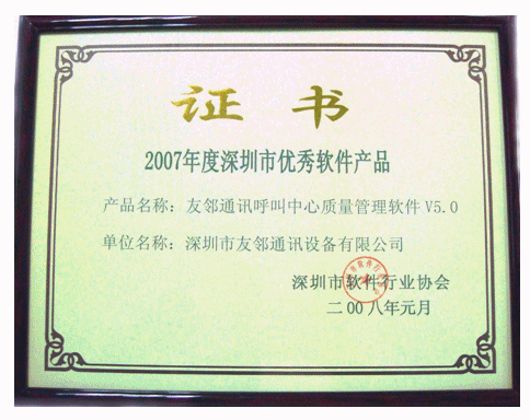 2008年3月14日,深圳市友鄰?fù)ㄓ嵲O(shè)備有限公司(以下簡稱“友鄰?fù)ㄓ崱保┬,公司主打軟件產(chǎn)品“友鄰?fù)ㄓ嵑艚兄行馁|(zhì)量管理軟件V5.0”(即 AP Suite 呼叫中心質(zhì)量管理系統(tǒng)V5.0)榮獲深圳市軟件行業(yè)協(xié)會“2007年度深圳市優(yōu)秀軟件產(chǎn)品”榮譽(yù)稱號。