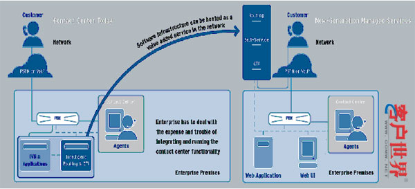 以國外的托管服務(wù)若建立在800號于C4/C5局用交換機(jī)上,許多用戶可以不用建制本地的排隊(duì)機(jī)就可以實(shí)現(xiàn)托管服務(wù)。目前國內(nèi)的運(yùn)營商若要直接在C4/C5局用交換機(jī)因?yàn)闆]有C4/C5的CTI服務(wù)器可以連接,所以有其困難的地方,只能采用800號智能網(wǎng)新增業(yè)務(wù)與本地企業(yè)排隊(duì)機(jī)連網(wǎng)的方式來完成。但國內(nèi)運(yùn)營商未來都會(huì)朝向NGN,采用軟交換的方向來看,企業(yè)可能再也不用采購本地排隊(duì)機(jī),對于呼叫中心托管的業(yè)務(wù)是一個(gè)很好的方向。