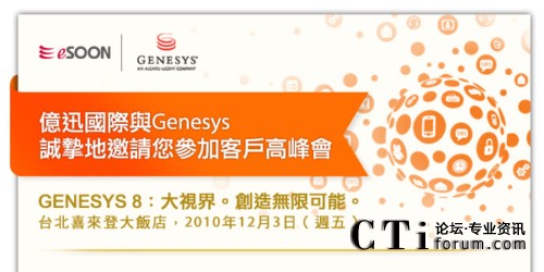持續(xù)優(yōu)化企業(yè)績(jī)效及培養(yǎng)意見(jiàn)領(lǐng)袖,都是協(xié)助我們?cè)谂_(tái)灣的用戶與其客戶有更佳交流往來(lái)的重要作法,因此,我們特別籌辦了‘客戶高峰會(huì)’,全面邀集來(lái)自Genesys新加坡、香港及中國(guó)的專家和同儕與您面對(duì)面,進(jìn)行互動(dòng)的知識(shí)分享與意見(jiàn)交換。