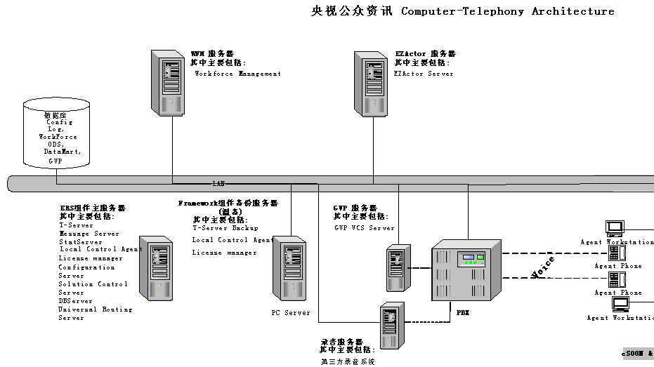 改建后的CCTV公眾資訊中心系統(tǒng),配置了帶冗余備份的Genesys Framework基本平臺及ERS企業(yè)路由解決方案、WFM人力資源管理解決方案、GVP自動語音應答解決方案和EZactor呼叫中心CRM平臺。