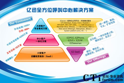 Service Software”;而“易之愛(ài)彼喜喜”及“易之風(fēng)”產(chǎn)品,顧名思義,就是億迅推出基于CESS理念的呼叫中心產(chǎn)品EZIPCC及EZPhone的中文注釋?zhuān)驗(yàn)楹?jiǎn)單容易,讓客戶(hù)更喜歡;“CHANGE”不僅代表了億迅發(fā)展的這11年一直秉持創(chuàng)新與改革的經(jīng)驗(yàn)哲學(xué),也代表了億迅自主研發(fā)的核心CRM產(chǎn)品“EZactor”在高端市場(chǎng)與主流戰(zhàn)略合作伙伴的關(guān)系,其中的“C”,是指CISCO;“H”指Huawei;“A”指“AVAYA”;“N”指Nuance;“G”指Genesys;而最后的“E”,則代表了eSOON。