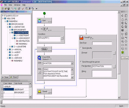 為了最大限度地方便用戶, Visual Editor 為 IVR 腳本的編寫提供了一整套可視化的圖形工具. 在它的集成開發(fā)環(huán)境中, 你可以執(zhí)行定義一套語音文件, 定義和初始化一些變量, 定義 DSN 和一些記錄集, 加入新結(jié)點等操作.