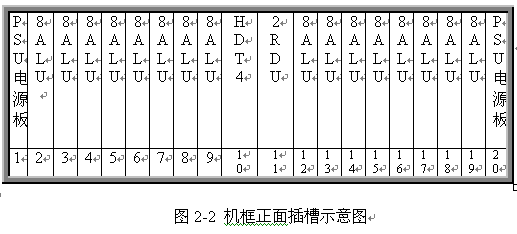 見圖 2 和 3 ,遠端模塊采用 19 英寸標準機框,高度為 5U ,可安裝在各種標準的 19 英寸的機柜中。機框共 20 個插槽,正面插板,反面背板出線。每個機框可插 20 塊各種類型的板件,其中兩邊第 1 第 20 槽固定插電源板 PSU ,中間第 10 號槽固定插數(shù)字中繼接口板 HDT4 ,其余 16 個槽為通用槽口,可插 16 塊各種類型接口板。每塊板為 8 路,一個機框總共 128 話路。調度接口板 2RDU 固定插第 11 槽,該板不占機框端口。對于自帶交換系統(tǒng),需要安裝一塊系統(tǒng)信號音板 8TDU ,該板固定插 19 槽,占 8 個端口。