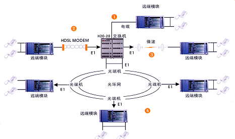 遠端模塊通過標準 2M ( E1 )接口與交換機連接。該接口不受傳輸距離和傳輸設備的限制。常用的傳輸設備有 SDH 、 PDH 光端機(光纜),數(shù)字微波、數(shù)字擴頻, HDSL 調制解調器(雙絞線)等。