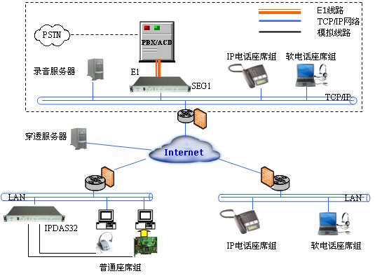 采用SEG1 IP數(shù)字座席分流器將呼叫中心交換機(jī)/板卡E1座席接口連接到IP網(wǎng)絡(luò),遠(yuǎn)端可采用IP模擬座席分流器IPDAS32提供模擬座席電話,也可以采用軟電話或IP網(wǎng)絡(luò)話機(jī)作為座席電話。從而為傳統(tǒng)的交換機(jī)/板卡升級(jí)了IP座席功能.