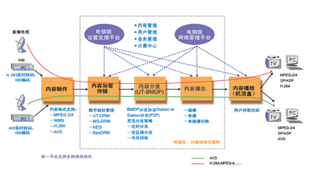 奔流(RollingStream)系統(tǒng)為IPTV業(yè)務(wù)提供了端到端的業(yè)務(wù)解決方案,先進的系統(tǒng)架構(gòu)對Codec完全透明,可透明支持AVS,如下圖。奔流(RollingStream)系統(tǒng)包括內(nèi)容制作、內(nèi)容存儲/加密、內(nèi)容分發(fā)、內(nèi)容播放、終端顯示的各個方面,都可提供基于電信級的解決方案。