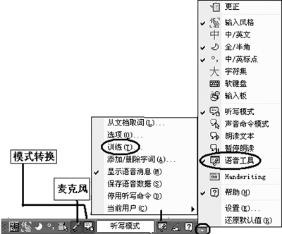 如果您以后想再次進(jìn)行語(yǔ)音訓(xùn)練,那么,可以點(diǎn)擊語(yǔ)言欄上的“語(yǔ)音工具”按鈕,然后單擊“訓(xùn)練”來(lái)對(duì)計(jì)算機(jī)進(jìn)行語(yǔ)音識(shí)別的訓(xùn)練(如圖3)。