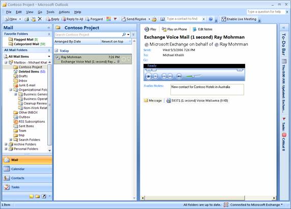 Outlook 2007,它將語音郵件作為優(yōu)先數(shù)據(jù)類型來集成。Outlook 2007 界面允許用戶連同其它數(shù)據(jù)項一起對語音郵件消息進行排序、搜索和確定其優(yōu)先級;此外,用戶可以在他們的座機上播放語音郵件消息,并向語音郵件消息添加附注,以便連同關(guān)聯(lián)的發(fā)件人和日期信息一起對消息內(nèi)容建立索引。(請參見圖2)Outlook