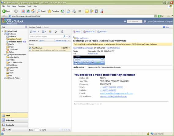 Outlook Web Access 2007,它允許用戶從瀏覽器會話中訪問語音郵件和傳真數(shù)據(jù)。OWA 2007 提供了對許多 Outlook 2007 功能的基于瀏覽器的無處不在的訪問,包括在計算機或電話機上回放語音郵件消息的能力和創(chuàng)建并收聽音頻附注的能力。(請參見圖3)