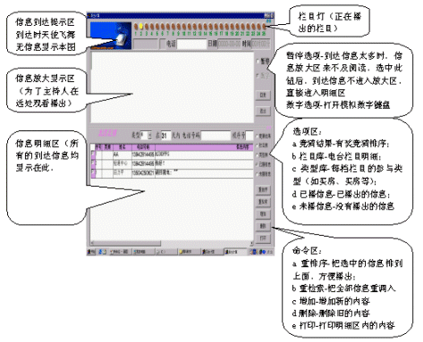 如果信息到達(dá)量過大,會(huì)導(dǎo)致信息放大區(qū)中的信息不斷被更新,此時(shí),只要選中暫停選項(xiàng),信息放大區(qū)的信息就不會(huì)被更新。該信息播出后,如果需要播出明細(xì)區(qū)中的內(nèi)容,只要在明細(xì)區(qū)中用鼠標(biāo)左鍵雙擊該信息的信息內(nèi)容,該信息內(nèi)容立即上升到放大區(qū)中,同時(shí)該信息發(fā)送人的姓名、性別、電話、日期、時(shí)間會(huì)同時(shí)上升到放大區(qū)上方,而且該信息內(nèi)容會(huì)自動(dòng)轉(zhuǎn)移到已播出信息中(這樣可以迅速明細(xì)區(qū)中的信息減少,方便主持人播出其他信息)。